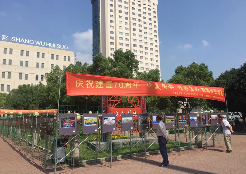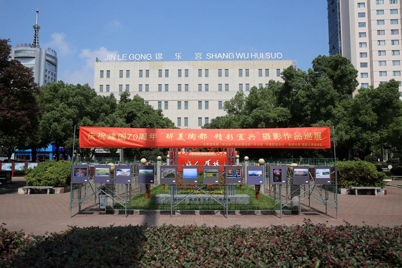 2019年9月30日,由宜兴市委宣传部、宜兴市文明办、宜兴市文体广电和旅游局、宜兴市文联主办,宜兴市摄影家协会、“陶都光影”摄影志愿服务队承办的庆祝中华人民共和国成立70周年“醉美陶都 精彩宜兴” 摄影图片巡展(宜城站)在文化广场(好人广场)展出。 在举国上下欢庆新中国70华诞之际,宜兴摄影人用摄影作品的形式歌颂祖国的繁荣昌盛,展现了我市建国70周年来各项各业翻天覆地的新面貌、新气象、新成就。这是“新时代文明实践在宜兴”摄影图片巡展巡展的第三站,今后将摄影巡展送到部分乡镇。本次共展出近百位摄影家会员和爱好者118幅优秀摄影作品,10月8日结束。